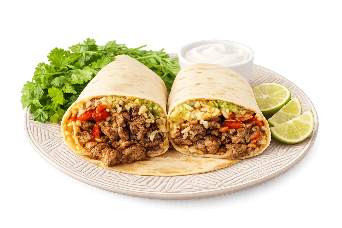 grilled steak wrapped with rice, beans, and fresh salsa
