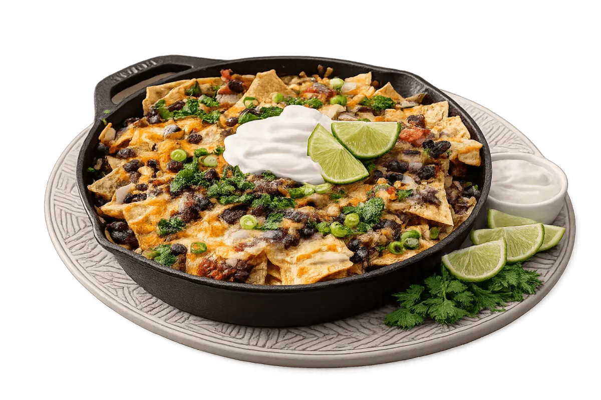 crispy chips topped with seasoned meat, cheese, and fresh toppings
